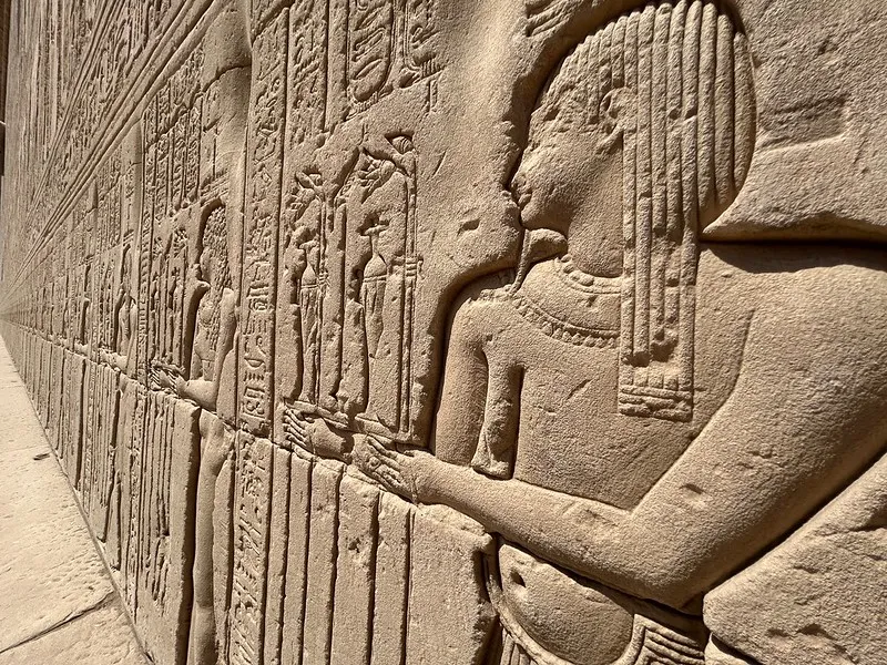 Der Tempel von Dendera hat viele seiner ursprünglichen Farben bewahrt, insbesondere das auffällige Blau, und ist der Göttin Hathor geweiht. Die Wände sind reich verziert mit Reliefs, auf denen unter anderem Darstellungen von Cleopatra zu sehen sind. Im Inneren ist der Tempel atemberaubend, mit imposanten Säulen und einer wunderschön verzierten Decke. Hier finden Sie auch das berühmte Zodiak von Dendera.
