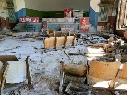 Im Kulturhaus sind die Erinnerungen an die letzte Maifeier aus dem Jahr 1986 noch sichtbar. Alte sowjetische Pamphlete, Slogans und Banner sind stille Zeugen dieser letzten Feier. Zwei Tage später wurden die Einwohner evakuiert.