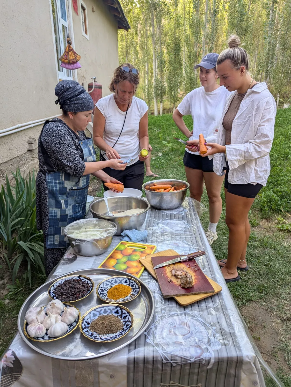 Während unserer Reise nahmen wir an einem Plov-Workshop teil. Das Fleisch langsam schmoren lassen, die Karotten hacken, dann den Reis hinzufügen, vor allem das Feuer und die richtige Temperatur sind entscheidend, wie wir lernten. Und natürlich durften wir danach gleich probieren, sehr köstlich!