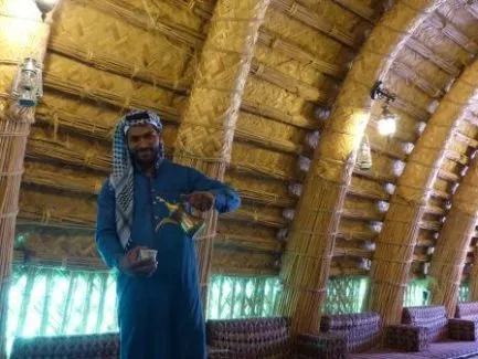 Der Mozif nimmt eine wichtige Position in der Kultur der Araber ein. Es handelt sich um eine Gästeunterkunft, die aus Schilfrohr mit charakteristischer runder Form gebaut ist. Gäste dürfen hier mindestens drei Tage auf Kosten des Gastgebers verweilen. Sie wurden oft als eine Art Karawanserei für Reisende genutzt. Die Mozifs sind auch eine Art Gemeinschaftshaus, in dem die Ältesten des Dorfes zusammenkamen, um wichtige Angelegenheiten zu besprechen. Die Mozifs haben keine Tür; jeder ist willkommen. Über einen niedrigen Eingang gelangt man hinein, wodurch man sich immer bücken muss und damit Respekt zeigt. Im Mittelpunkt stehen die Rituale des Kaffee- und Teeschenkens im Mozif. Leider sind die meisten Mozifs verschwunden. Es gibt jedoch einige Mozifs, die gebaut wurden, um "neue" Gäste zu empfangen, nämlich Touristen. Dadurch bleibt die Kultur nicht völlig verloren, und Reisende können erleben, wie es ist, in einem Mozif zu schlafen. Ein solcher Ort befindet sich in Bardiye, etwas außerhalb von Ahvaz. Ein weiterer solcher Ort befindet sich auf der Insel Minoo, nahe Abadan. Dort gehe ich jetzt hin. Die Schönheit der Insel Minoo enttäuscht jedoch sehr. Früher war sie hier atemberaubend, erzählt der Betreiber der Mozifs. Eine Insel voller Dattelpalmen, gelegen an den Ufern des Shat-al-Arab-Flusses. Die Insel wurde jedoch im Krieg vollständig plattgebombt. Die Mozifs sind allerdings wunderschön. Wir werden herzlich empfangen, erleben die Kaffee- und Teeceremonie und erhalten köstliche arabische Süßigkeiten. Ein schöner und überraschender Ort zum Übernachten, leider etwas weit weg von allem. Besonders interessant, wenn Sie die Reise in Abadan beginnen oder enden möchten oder auf der Suche nach einer ganz anderen Art des Übernachtens sind.
