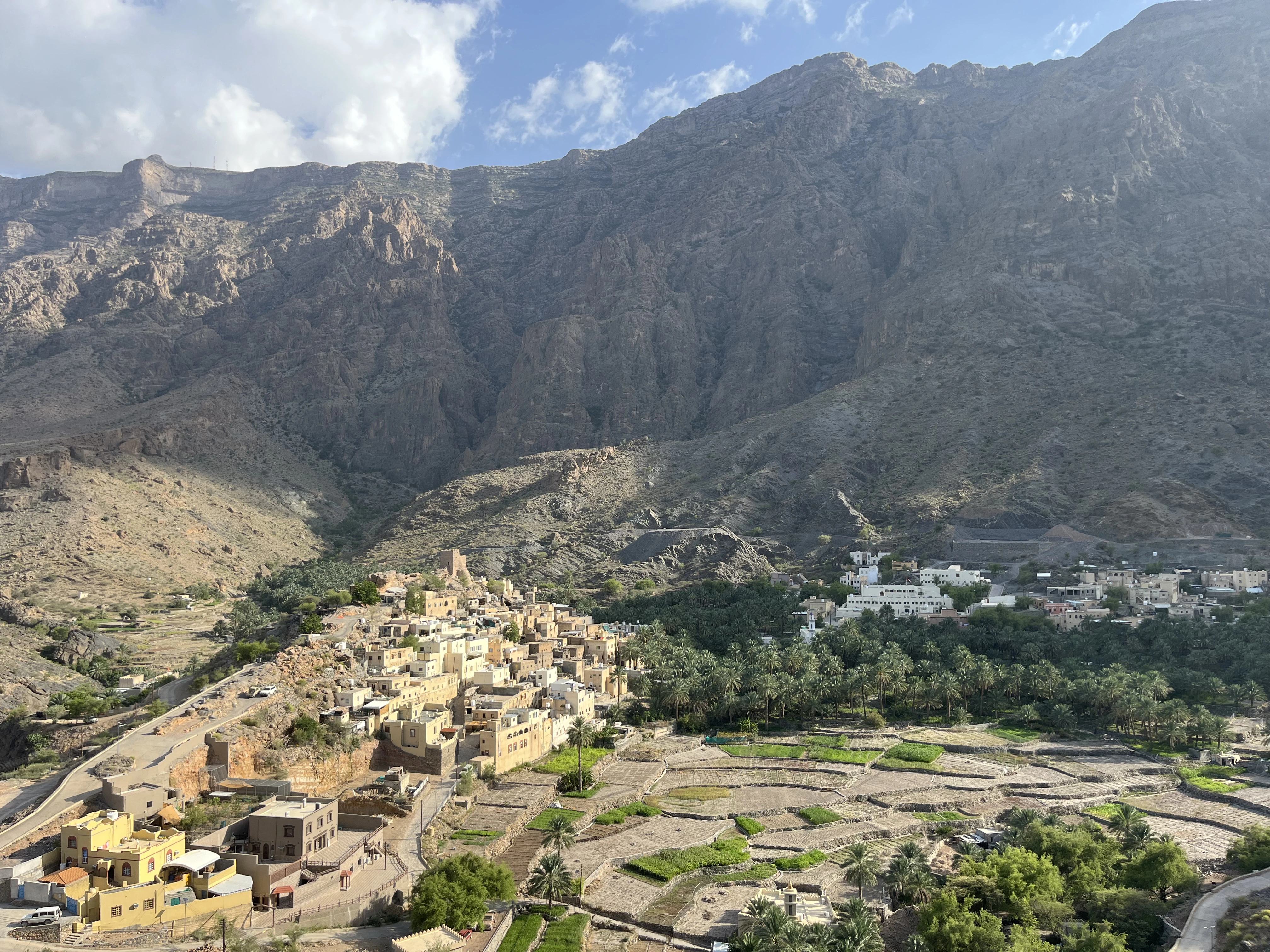Nach einer erholsamen Nacht in der grünen Umgebung von Misfat al Abriyyin und einem kurzen Spaziergang durch die Landschaft mit herrlichem Blick zwischen den Palmen ist der nächste Halt Al Hamra.