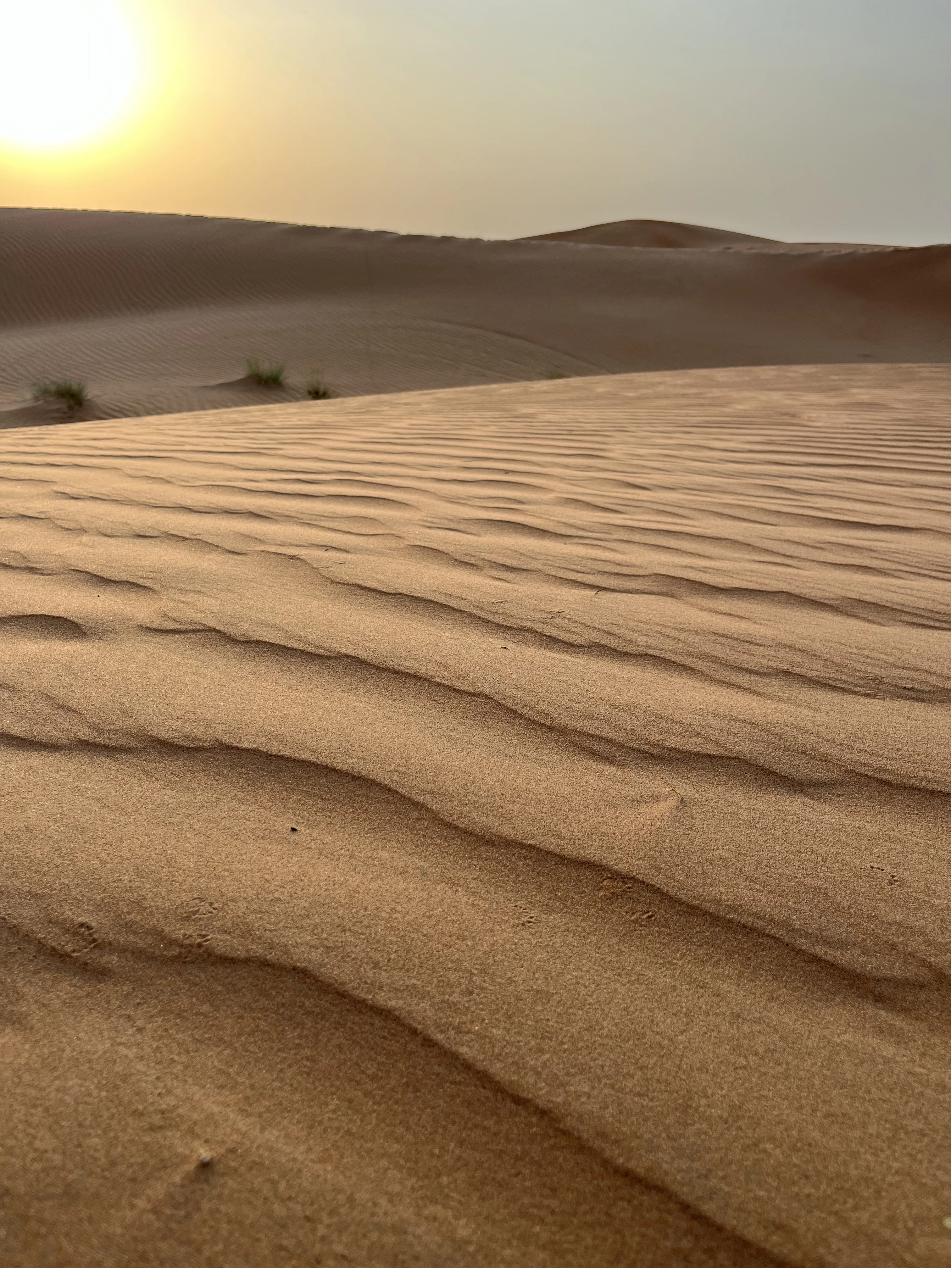 Eines der Highlights der Reise ist der frühe Morgen in der Wüste. Um 4:40 Uhr stehen wir auf, noch im Dunkeln, und wandern auf die Spitze einer Düne, um den Sonnenaufgang zu erleben. Die Stille und das Spiel des Lichts über die Sandlandschaft sind beeindruckend. Nach dem Frühstück im Camp fahren wir Richtung Maskat, durch Wüstenlandschaften und grüne Wadis.