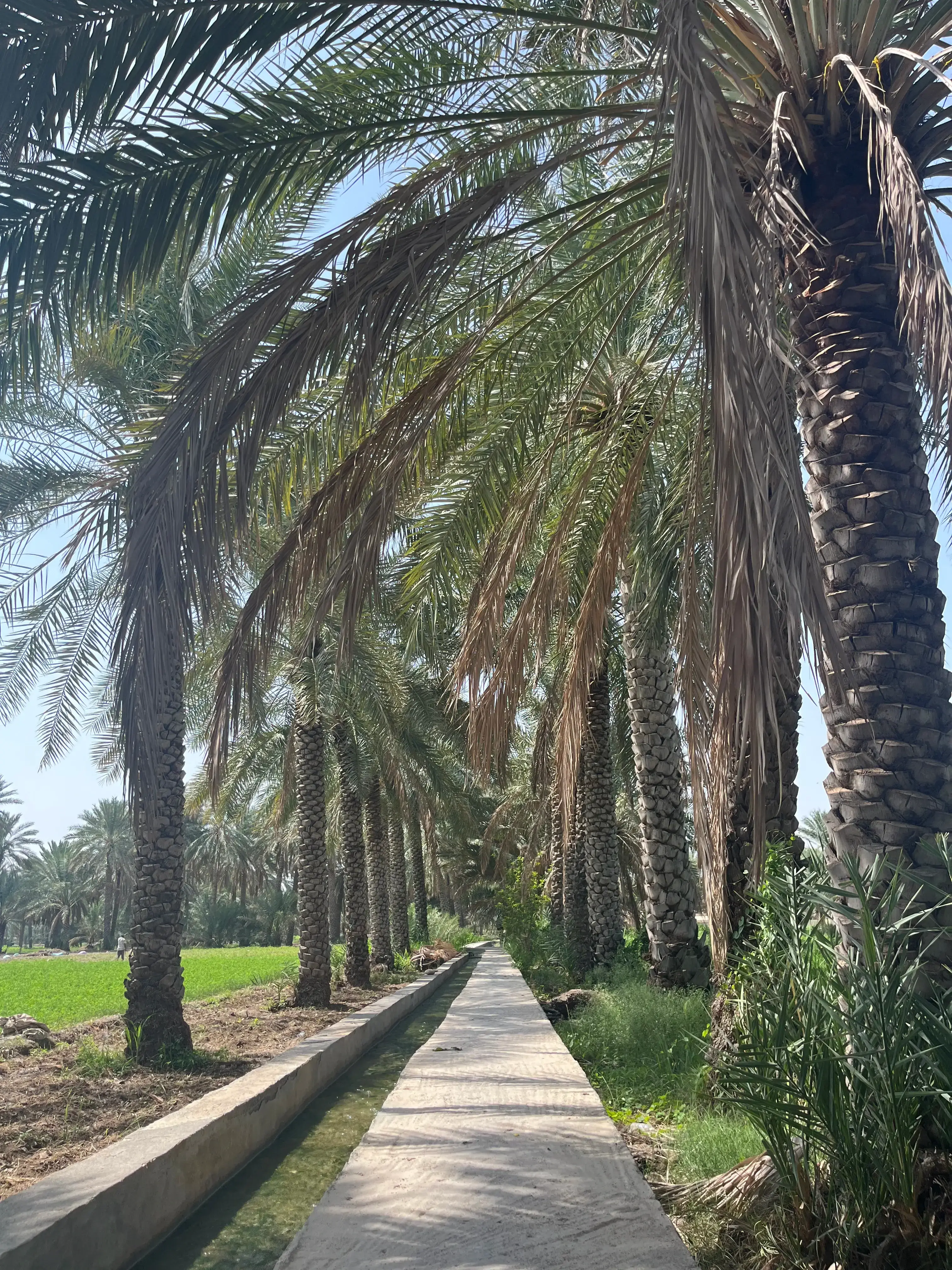 Dann verließen wir das bewohnte Gebiet und fuhren „off road“ auf schmalen Betonpfaden zwischen den Palmen. Ein tolles Erlebnis und angenehm kühl, da die Palmen Schatten spendeten. Ich habe nicht gezählt, wie viele Palmen es in Al Hamra gibt, aber es sind unzählige! Viele Familien besitzen eine bestimmte Anzahl an Palmen, von denen sie die Datteln ernten. Jeden Tag gibt es einen Plan, wann welcher Besitzer seine Bäume bewässern und pflegen darf.