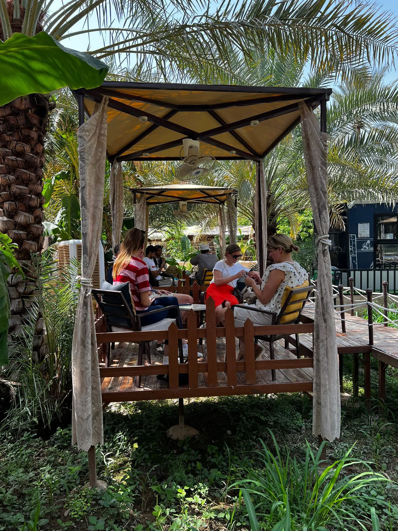 Nach der Tour und dem Besuch der Altstadt machten wir Pause im charmanten Saaf Café. Das Café liegt idyllisch zwischen den Palmen, fast wie in einer Oase. Auf der Terrasse gönnten wir uns einen eiskalten Drink. Die hausgemachte Pfirsich-Eistee ist absolut zu empfehlen! So ein hipper Ort in der Altstadt al Hamras, das hätten wir wirklich nicht erwartet.