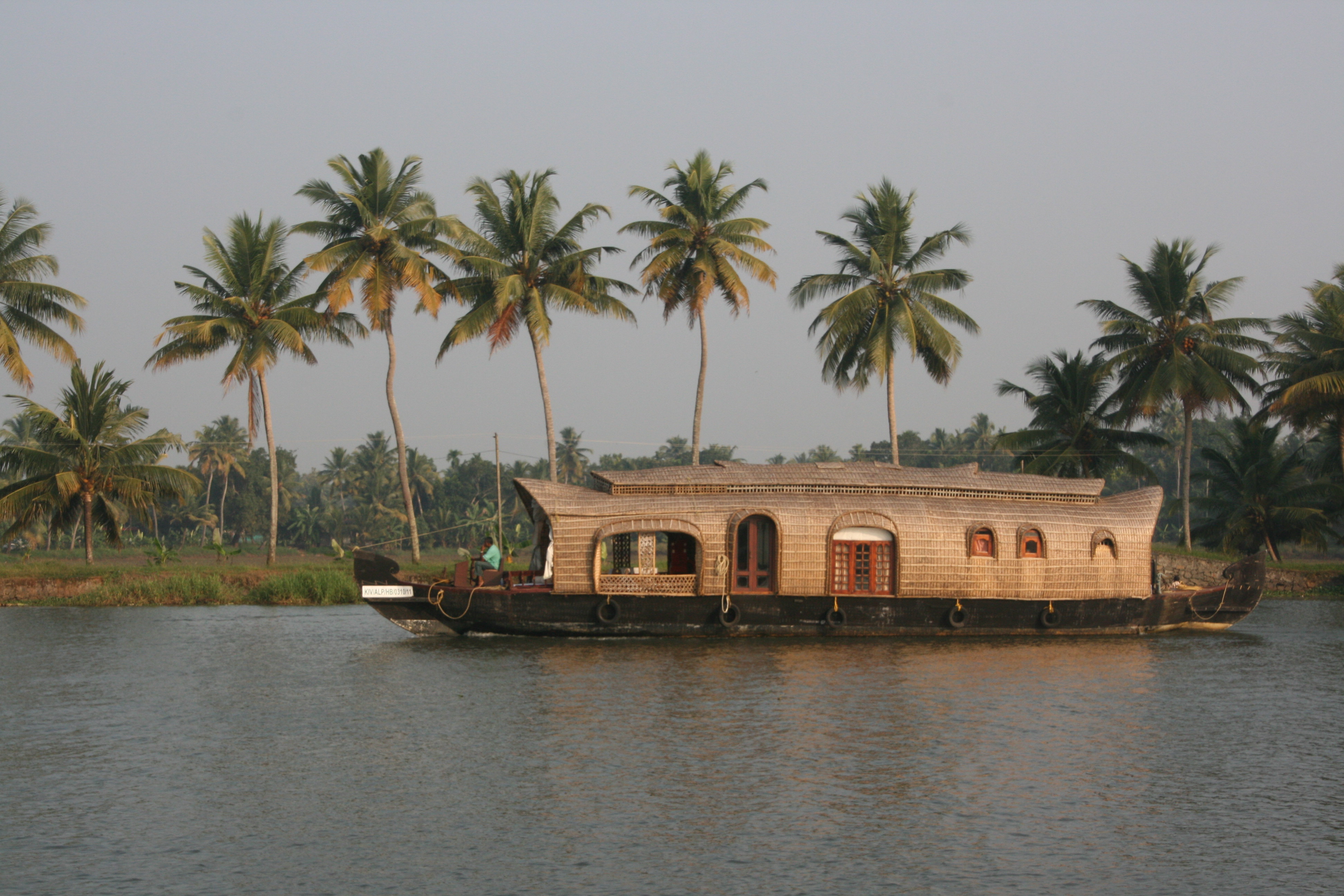 Langsam gleiten wir durch die stillen Backwaters von Kerala. Ein kleines Boot voller Gemüse und Früchte zieht vorbei, gesteuert von einem freundlichen Mann mit einer großen Ruderkelle.