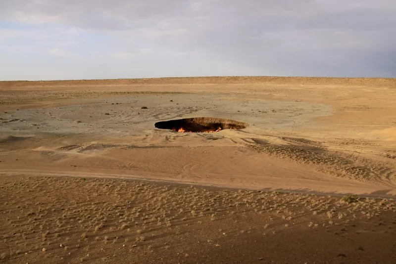 Darwaza ist ein großer Krater mit etwa 70 Metern Durchmesser und 30 Metern Tiefe, der ununterbrochen brennt. Das Feuer wird durch Erdgas gespeist, das aus unterirdischen Lagerstätten entweicht. Der Krater entstand 1971, als sowjetische Geologen auf der Suche nach Erdgasfeldern bohrten. Während der Bohrung brach der Boden plötzlich ein und hinterließ ein riesiges Loch. Um die Ausbreitung des giftigen Methans zu verhindern, beschlossen die Geologen, das austretende Gas anzuzünden – in der Annahme, dass das Feuer nach ein paar Tagen von selbst erlöschen würde.
