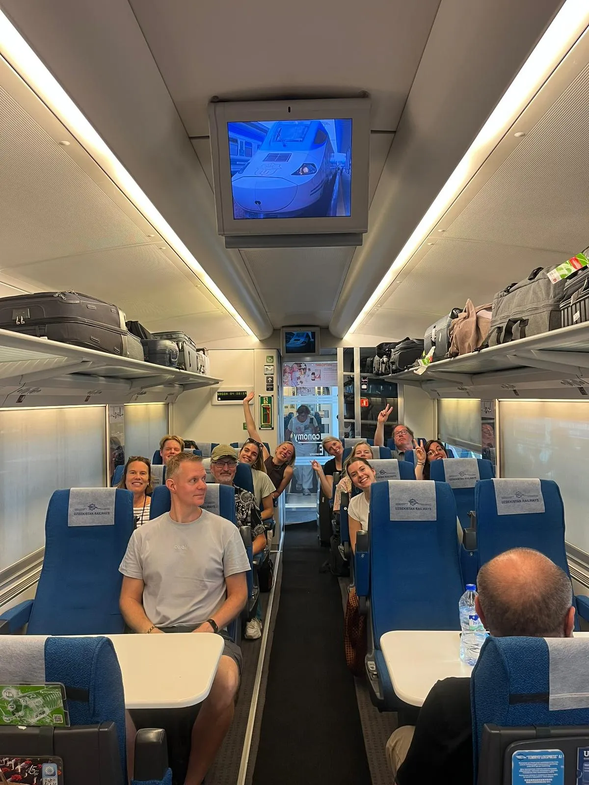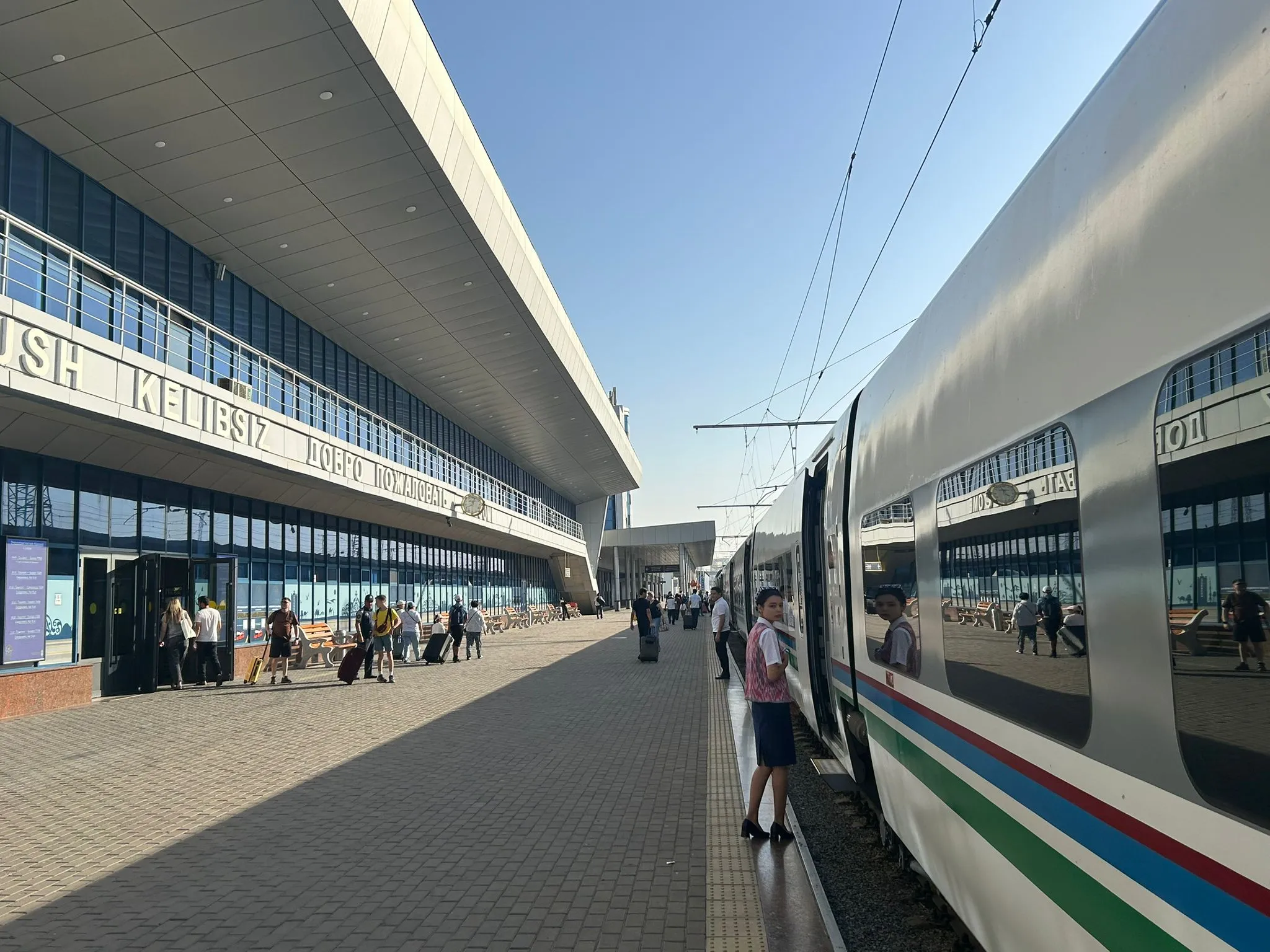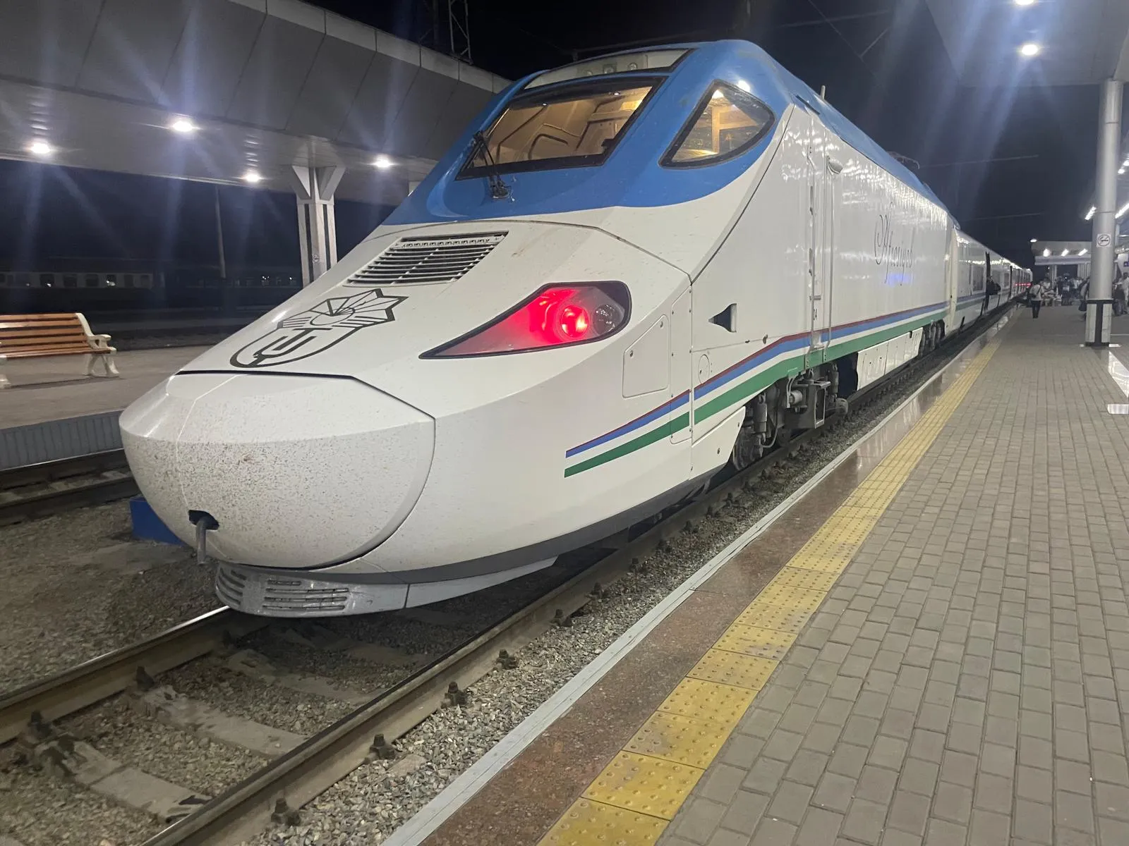 Wir kamen rechtzeitig am Bahnhof an, der Zug stand bereits bereit. Er ist nach Afrosiab benannt, einer alten Siedlung bei Samarkand, wo Sie Spuren von tausenden Jahren Geschichte entdecken können. Die Sitzplätze waren vorab reserviert, und an jedem Wagen stand ein freundlicher Mitarbeiter, der die Tickets kontrollierte. Am Anfang des Wagens gab es ein Gepäckregal, außerdem Platz über jedem Sitz. Selbst mein etwas zu großer Koffer, perfekt für alle Souvenirs, die ich mit nach Hause nehmen wollte, passte problemlos in das Gepäckfach über meinem Kopf.