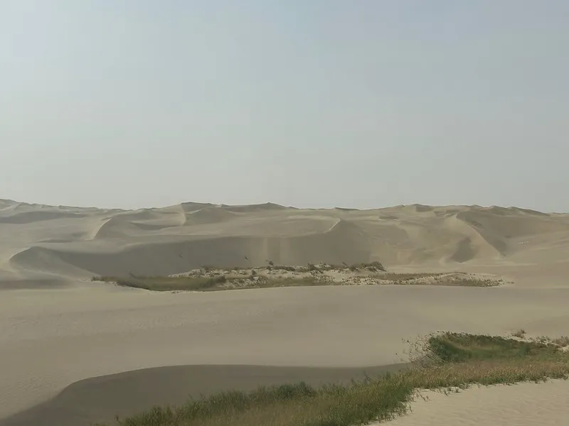 Manchmal fährt der Zug über hohe Viadukte, umgeben von nichts als welligen Sanddünen. Die Landschaft ist gleichzeitig öde und faszinierend. Gegen späten Abend erreichen Sie Ruoqian.