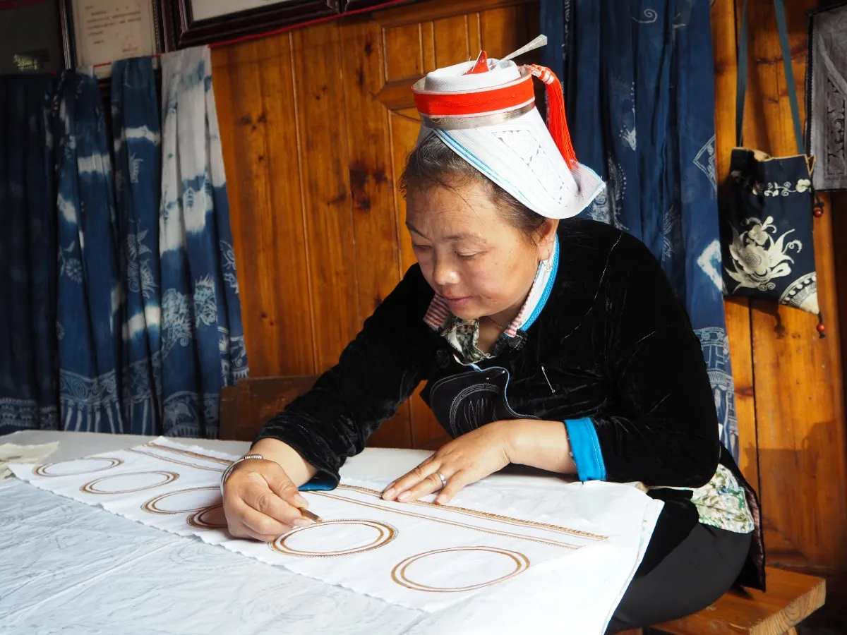 In Shidong lohnt es sich absolut, einen genaueren Blick auf die Stickerei zu werfen, mit der die lokalen Frauen beschäftigt sind. Gemütlich beieinander auf niedrigen Stühlen sitzend, mit Stickereien auf dem Schoß und gleichzeitig über die neuesten Klatschgeschichten lachend, versammeln sie sich im Dorf. Die Stickvorlagen sind Teil einer jahrhundertealten Tradition, die bis heute Bestand hat. Jungen Mädchen wird bereits ab ihrem siebten Lebensjahr beigebracht, wie man stickt, und je schöner ihre Arbeit, desto attraktiver werden sie von den jungen Männern gefunden!