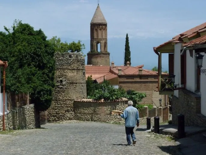 Anschließend fahren Sie weiter nach Sighnaghi, das auf einem Hügel mit schönem Blick über die Landschaft und die Berge des Niederen Kaukasus liegt. In Sighnaghi können Sie die Entwicklung des Landes deutlich sehen. Was vor nicht allzu langer Zeit noch ein heruntergekommenes Städtchen mit einer Homestay war, ist heutzutage das alte Zentrum komplett restauriert und bietet verschiedene Gästehäuser und Hotels. Der Tourismus in Georgien entwickelt sich deutlich, und die Regierung hat viel unternommen, um diese Region auf die Landkarte zu setzen. Alle Sehenswürdigkeiten sind klar beschildert. Sighnaghi ist heute ein malerisches Städtchen mit seiner alten Stadtmauer und den holprigen Kopfsteinpflasterstraßen. Über einen Teil der Stadtmauer können Sie spazieren und die Ausblicke auf das Kaukasusgebirge genießen.
