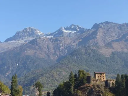 Durch seine hohe Lage hat man von der Dzong aus schöne Ausblicke. Auf der einen Seite blickt man ins Paro-Tal, auf der anderen Seite taucht der schneebedeckte Gipfel des Chomolhari auf, dem höchsten Berg im bhutanischen Himalaya.