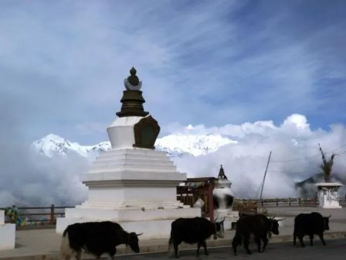 Sie reisen zu mehreren Aussichtspunkten, an denen Stupas errichtet sind. Von hier aus blicken Sie auf die vielen Gipfel des Meili-Schneebers, bei den Tibetern besser bekannt als Kawa Karpo. Dieser beeindruckende Berg ist einer der heiligsten Berge für die Tibeter, und jährlich kommen viele Pilger, um die Kora zu gehen. Diese Kora dauert 12 Tage. Sie unternehmen jedoch eine Wanderung zur Minyong-Gletscher am Fuße von Kawa Karpo. Sie steigen ab durch tibetische Dörfer, in denen sich verschiedene Weinberg befinden. Um zur Gletscher zu gelangen, absolvieren Sie eine anspruchsvolle Wanderung von 2-3 Stunden. Es ist ein anstrengender Anstieg, aber für jeden mit einer durchschnittlichen Fitness gut machbar. Auf Wunsch können Sie auch Pferde mieten, um nach oben zu gelangen. Unterwegs gibt es ein kleines Kloster. Von hier aus können Sie in einer halben Stunde weiter hinaufsteigen (steiler Anstieg!) für einen schönen Blick auf die Gletscher.
