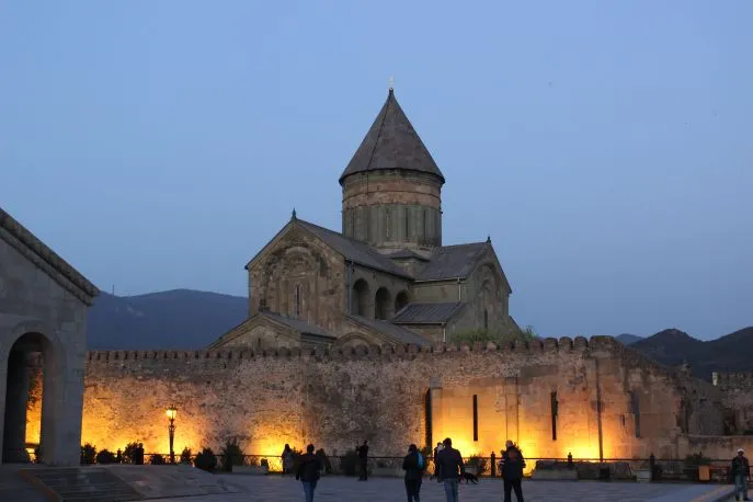 Sie reisen zurück in Richtung Tbilisi, das Sie links liegen lassen. In der Nähe liegt die alte Hauptstadt und das religiöse Zentrum des Landes: Mtskheta. Diese Stadt befindet sich am Zusammenfluss zweier Flüsse. Dort besuchen Sie das Jvari-Kloster aus dem 6. Jahrhundert und die Svetitskhoveli-Kathedrale aus dem 11. Jahrhundert. Wenn Sie Ihre Reise so planen, dass Sie am Sonntag in Mtskheta sind, können Sie hier die beeindruckende Sonntagsmesse der georgisch-orthodoxen Kirche miterleben. Innerhalb der mit Fresken geschmückten Wände der Kathedrale wird mehrere Stunden lang eine Messe gehalten, bei der die Chöre von himmlischer Schönheit sind. Menschen kommen in die Kirche und gehen wieder hinaus. Alte Damen sitzen auf den Bänken, Priester schwenken mit Weihrauch, und viele kommen, um ein Gebet für ihr Lieblingsikon zu sprechen.