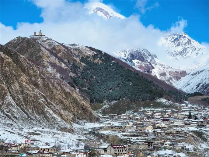 Optional können Sie auch einen Ausflug ins nahegelegene Stepantsminda unternehmen. Stepantsminda wird im Volksmund auch als Kazbegi bezeichnet, nach dem gleichnamigen Berg, der die Umgebung dominiert. Dieser beeindruckende 5033 Meter hohe Gipfel wurde nach dem Aufseher bei der Erstellung der Militärstraße, Kasibeg Tsjopikasjvili, benannt. Von Stepantsminda haben Sie einen schönen Blick auf diese wahrscheinlich am schönsten gelegene Kirche des Kaukasus: die Tsminda Sameba Gergeti (die Dreifaltigkeitskirche). Das Silhouette der Kirche hebt sich gegen die beeindruckende verschneite Spitze des Mt. Kazbeg ab. Sie können dorthin wandern oder mit einem 4WD-Fahrzeug zu dieser Kirche fahren.