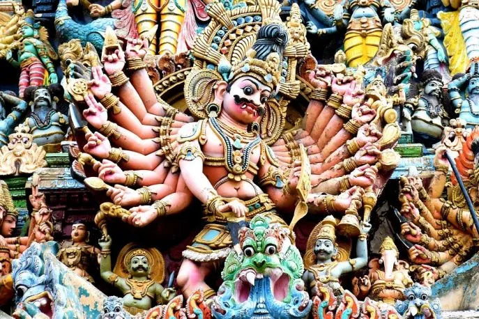 Das tägliche Leben in Madurai dreht sich buchstäblich und im übertragenen Sinne um den Sri Meenakshi-Tempel, eines der schönsten Tempelkomplexe ganz Indiens, der im Herzen der alten Stadt liegt. Mit seinen Gopurams, die mit üppigen Schnitzereien der fantastischsten, in leuchtenden Farben bemalten Götter, Göttinnen, Dämonen und anderen mythologischen Figuren des Hinduismus geschmückt sind, ist der Tempel ein spektakuläres Beispiel für dravidische Architektur. Der südliche Gopuram ist der höchste (und für Interessierte zu besteigen), der östliche – gegenüber dem Sundarehswara-Tempel – der älteste. Die gesamte Fläche des Komplexes umfasst etwa 6 Hektar. Der äußere Prakarma (Tempelring) wird von einem lebendigen Basar eingenommen, auf dem neben Opfergaben auch Saris, Gewürze, Plastikspielzeug, Ketten und Armbänder verkauft werden. In diesem Teil des Tempels befinden sich unter anderem das Heiligtum der Göttin Meenakshi (eine Inkarnation von Parvati), der Lotusteich (wo Hindus ein heiliges Bad nehmen können), die beeindruckende Hall der tausend Säulen (mit 997 Säulen) und das Tempel Kunstmuseum. Der östliche Eingang führt zum Ashta Shakti Mandapan, einem Saal mit acht Manifestationen der Göttin Shakti. Die Wandmalereien erzählen die Geschichte von Meenakshi als Prinzessin von Madurai. Der Haupttempel von Sundareshwara (eine Inkarnation von Shiva) im zentralen Prakarma bildet den ältesten Teil des Komplexes. Das Heiligtum ist für Nicht-Hindus nicht zugänglich. Von früh morgens bis spät abends sind die vielen Heiligtümer im Sri Meenakshi-Tempel stark frequentiert. Pilger aus nah und fern kommen, um ihrer Lieblingsgöttin Ehre zu erweisen. Täglich werden dort etwa 10.000 Besucher gezählt. Ein wichtiger Moment des Tages ist, wenn sich zwischen 21:00 und 22:00 Uhr vor dem Heiligtum der Göttin eine jahrhundertealte Zeremonie vollzieht: Sundareshwara (Shiva) verlässt dann sein Zimmer, um die Nacht bei Meenakshi zu verbringen, ein Umzug, der von lautem Beckenklirren und Hornsignal begleitet wird. Außen am östlichen Gopuram des Sri Meenakshi-Tempels befindet sich der Puthu Mandapam (auch Vasantha Mandapam genannt). Früher gehörte diese prächtige überdachte Säulengalerie zum Tempel, heute haben dort Hunderte von Handwerkern ihre Werkstätten, insbesondere Schneider, Metallarbeiter und Händler. Die endlose Reihe von Ständen lädt zum Kauf von Souvenirs ein. Besonders maßgeschneiderte Kleidungsstücke und Bronzeskulpturen erfreuen sich bei vielen Besuchern großer Beliebtheit.