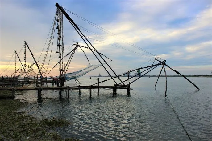 An der Küste von Fort Kochi stehen die berühmten chinesischen Fischernetze. Diese wurden einst von Händlern aus dem Hof von Kublai Khan hier aufgestellt und werden noch immer zum Fangen von Fisch verwendet. Es handelt sich um raffinierte Holzkonstruktionen, bei denen das Netz bei Hochwasser abgelassen wird. Nachts brennt über dem Netz eine Lampe, um die Fische anzulocken.