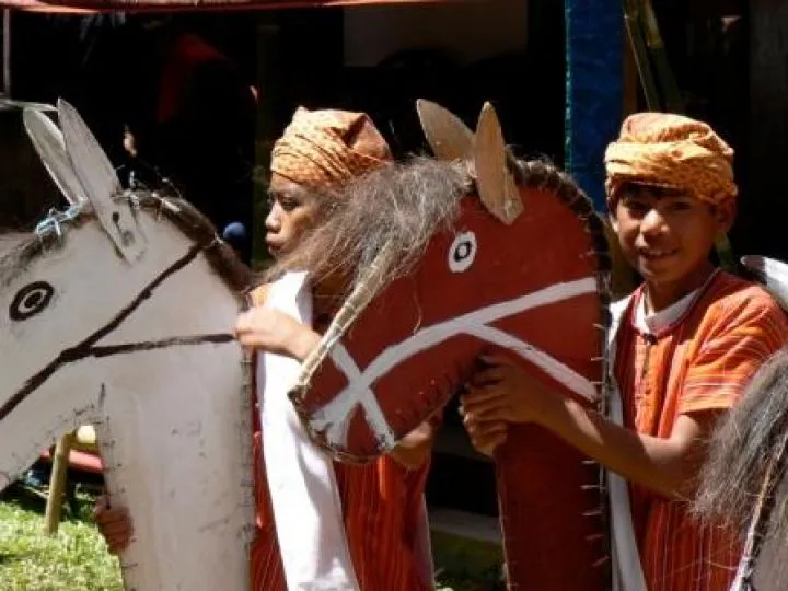 Die anderen Gäste bringen nun neben den lebenden schwarzhaarigen Schweinen, die an Bambuspflöcken hängen, auch Wasserbüffel mit. Diese hängen nicht an Stangen, denn es sind wirklich riesige Tiere. Jedes Mal, wenn eine neue Gruppe einheimischer Gäste ankommt, werden ihre Schweine und Wasserbüffel präsentiert, indem sie auf den Innenhof gebracht werden, während die Gruppe von Gästen an den Särgen der Verstorbenen vorbeizieht. Die Tiere sind von bunten, aber zurückhaltenden Tänzen der Tänzerinnen umgeben, die mit Perlenwesten bekleidet sind. Dann betritt eine Gruppe von rund 50 Männern den Raum, die in einem Kreis um die Tiere stehen. Sie singen in einer einfachen Melodie immer wieder dasselbe traumhafte, romantische Lied. Dazu machen sie einfache Tanzschritte. So begleiten sie die Verstorbenen auf sichere Weise in den Himmel.