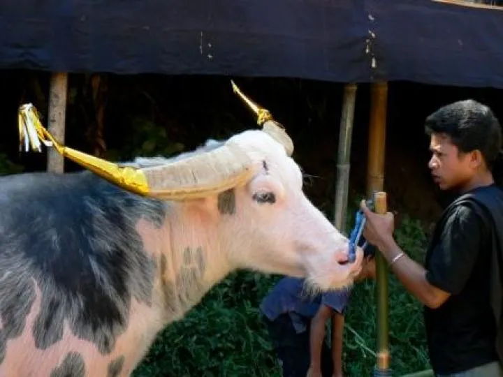 Ein Seil, das durch ein Stück Plastikschlauch läuft, zieht sich durch seine nasse Nase, die ein wenig schief aussieht und durch dasselbe Stück Seil wie ein Stück schwarze nasse Erde wirkt. Sein massiger Kopf und sein starker, breiter Hals lassen sich nicht verspotten. Sein Hals ist so breit, dass kein Seil richtig darum passt, daher das Seil durch die Nase. Das ist zumindest die Erklärung seines stolzen Hüters, der ihn im Auge behalten darf. Seine gigantischen Hörner, die weit herausragen – eines zeigt übrigens nach unten und das andere in den Himmel – zeugen von ihrer Kraft. Seine weißen Augen und die weiß-rosafarbene Haut mit grauen Flecken sehen ein wenig niedlich aus. Ein Albino-Wasserbüffel erscheint mir doch ein wenig bemitleidenswert. Aber nicht für die Toraja. Ein Albino-Wasserbüffel wird gehegt und gepflegt. Es ist der wertvollste Wasserbüffel, der im Toraja-Land existiert. Für einen starken, ausgewachsenen Albino-Wasserbüffel werden schnell 100 Millionen Rupiah bezahlt. Das sind etwa 60.000 Euro! Diese Wasserbüffel werden auch wie Babys behandelt. Sie werden ausgezeichnet mit frischem Gras gefüttert, es wird täglich mit ihnen spaziert, als würde man den Hund ausführen. Einmal täglich genießen sie ein umfangreiches Bade-Ritual. Und das geschieht meist am Ende des Tages. Der Fluss liegt dann wie ein persönliches Spa auf sie wartend bereit. Sie treiben gemütlich im Wasser, ab und zu gibt es eine Massage vom Badew Jungen. Im wahrsten Sinne des Wortes. Ein wahrer Toraja-Mercedes. Der gewöhnliche dunkelgraue Wasserbüffel hat auch seinen Wert. Dafür werden dennoch schlappe 40 bis 60 Millionen Rupiah bezahlt. Immerhin sind das schnell mal 25.000 Euro. Ein Kalb kostet 5 Millionen Euro. Wie soll so ein Tier das je wieder einspielen? Da muss doch etwas anderes hinter dem Gras stecken, oder in diesem Fall unter dem Reis, als nur das Pflügen der Reisfelder? Das Geheimnis wird mir von Cornelius, einem Toraja-Jungen mit einem sehr christlichen Namen, verraten. Die Wasserbüffel waren von jeher das Zahlungsmittel im Toraja-Land. Das ist sozusagen ein wenig aus dem Ruder gelaufen. Ein Tonganan (das traditionelle hölzerne Toraja-Haus mit einem Dach in Form des Unterteils eines Bootes) kostet 4 bis 5 Wasserbüffel. Auch das Schwein wird dafür eingesetzt. Diese Toraja-Wasserbüffel stehen nicht mehr für die Pflugarbeit. Heutzutage werden die Wasserbüffel als Geschenke für die Verstorbenen verwendet, für die eine Zeremonie abgehalten wird. Am letzten Tag einer solchen Zeremonie werden die Särge in die Höhlen getragen und die Tiere geschlachtet.