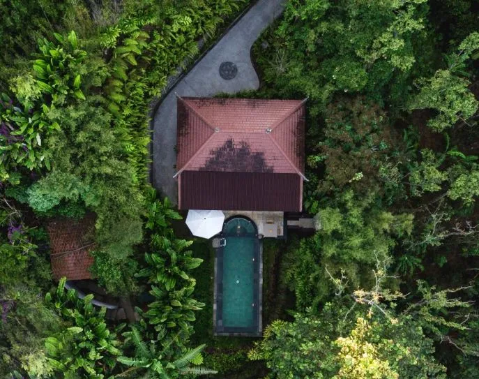 Sie übernachten hier in einem wunderschön gelegenen Ecoresort, an den südlichen Hängen des Mount Batukaru. Vom Hotel aus blicken Sie auf die herrlichen bewaldeten Hänge von Batukaru und die weitläufigen Reisfelder. Es gibt nur 5 luxuriöse Villen. Diese Villen sind weit voneinander entfernt, um maximale Privatsphäre zu gewährleisten, was eine intime und ruhige Atmosphäre schafft. Alle Villen bieten einen atemberaubenden Blick über die weitläufigen Reisfelder mit den grünen Wäldern von Bali im Hintergrund. Bei klarem Wetter können Sie sogar das Meer sehen. Im Restaurant können Sie köstliche biologische Gerichte genießen, die ohne Zusatzstoffe aus regionalen Produkten zubereitet werden.