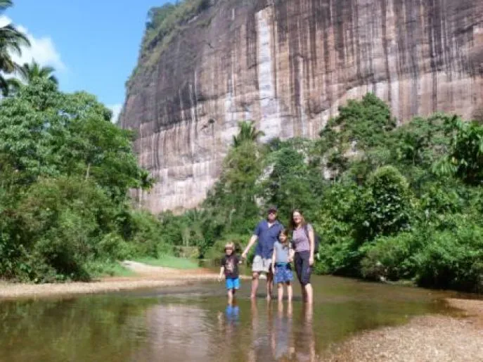 Heute unternehmen Sie mit Ihrer Familie eine schöne Wanderung durch das Tal. Sie wandern durch Reisfelder und vorbei an kleinen Minangkabau-Dörfern, umgeben von einer riesigen Felswand. Die Menschen arbeiten auf den Feldern, und es gibt eine enorme Vielfalt an Obstbäumen. Während der Wanderung erfahren Sie viel über das Leben hier. Oben finden Sie undurchdringlichen Dschungel, wo Gibbons Sie ankreischen, auch wenn Sie sie selten zu Gesicht bekommen. Die Wanderung endet an einem Wasserfall für einen erfrischenden Sprung ins Wasser. Hier genießen Sie auch ein leckeres Picknick-Mittagessen. Ende des Vormittags kehren Sie zu Ihrer Homestay zurück, und der Rest des Nachmittags steht Ihnen zur freien Verfügung.