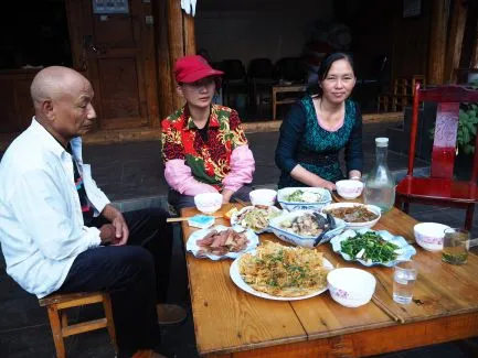 Abends darf ich im Innenhof mit Aussicht bei Opa und den Schwestern Platz nehmen. Die Schalen mit Kartoffeltörtchen, scharf gewürztem Schweinefleisch und süß-saurer Salat stehen bereits auf dem Tisch. Und dann ist der Abend komplett: Herr He zeigt seinen Kopf um die Ecke und auch er setzt sich für ein selbstgebranntes (starkes) Getränk dazu. Und da schlafen wir wie Ochsen.