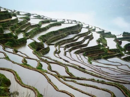 Diese Geschichte höre ich in Jiali, einem traditionellen Dong-Dorf, umgeben von den schönsten Reisfeldern, die ich je gesehen habe. Viele der Felder sind so klein, dass nicht einmal ein Wasserbüffel hineinpasst. Es ist Mai, die Terrassen stehen unter Wasser und überall wird hart gearbeitet. Männer pflügen – mit oder ohne Wasserbüffel – die Erde, und die Frauen räumen die Terrassen leer. Einige Frauen müssen gezwungenermaßen ihre Kleinen mit auf das Feld nehmen; mehrmals sehe ich Frauen, bis zu den Knien im Wasser, gebückt in einem Reisfeld mit ihrem Kind in einer Trage auf dem Rücken. Das ist wirklich harte Arbeit…