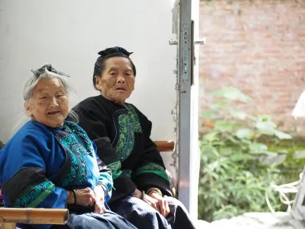 Zickzackend durch die Berge passieren wir verschiedene Dörfer; bei einigen steigen wir aus, um uns umzusehen. So auch im besonders schönen Miao-Dorf Koushen (wo die Shortskirt-Miao mit ihren prachtvoll bestickten Röcken und schwarzen Spitzhüten leben) und im Dong-Dorf Benli. Die Frauen in Benli tragen traditionelle blaue Kleidung mit wunderschönen Stickereien. Ich gehe kurz zu zwei alten Damen hinein, die auf einem Bett sitzen und uns voller Staunen ansehen. Ausländer kommen hier selten. Sie deuten, dass ich mich zu ihnen setzen soll. Bei meinem Guide Zengou, der selbst ein Dong ist, entschuldigen sie sich: Sie sind fast 90 Jahre alt, zu alt, um zu laufen, und nicht in der Lage, uns Essen oder Trinken anzubieten. Wir sagen, dass sie sich vor allem gut von der jüngeren Generation umsorgen lassen sollen, sie haben es verdient!