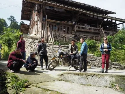 Unser Spaziergang durch das Dorf endet oben auf dem Berg, wo ein wunderschönes Holzhaus vor uns auftaucht. Das älteste Haus des Dorfes, so Panhui. Einige Männer, die in einem Kreis vor dem Haus Zigaretten rauchen, deuten, dass wir gerne hineinschauen dürfen. Ich gehe ins Haus, steige – um mein Leben fürchtend – die knarrende Treppe hinauf und komme auf eine Etage mit drei verschiedenen Zimmern. Wir haben einen herrlichen Blick über das Dorf.
