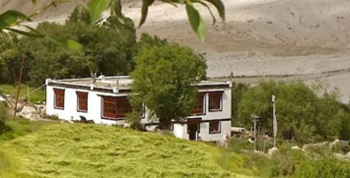 Sie verbringen einige Tage in einer Ecolodge und lernen so das 'echte' Ladakh kennen. Die Lodge liegt in einem Tal, in dem sich zwei majestätische Gebirgszüge kreuzen: der Himalaya und der Karakorum. Die Lodge befindet sich inmitten einer Oase, umgeben von grünen Feldern, Weidenbüschen, Pappeln, Wildrosen und Tamarisken. Das beruhigende Plätschern von Bergbächen ist allgegenwärtig. Die Lodge liegt in einer ruhigen Umgebung für jeden, der in der Wildnis abseits der ausgetretenen Pfade sein möchte. Sie ist ideal für Familien, Paare, Natur- und Vogelbeobachter sowie für diejenigen, die an Wanderungen, Trekking, Reiten und Kamelreiten teilnehmen möchten. Sie können im Frühling beim Pflügen, Säen und Ernten von Gerste und beim Hüten der Yaks auf den hochgelegenen Weiden mithelfen.