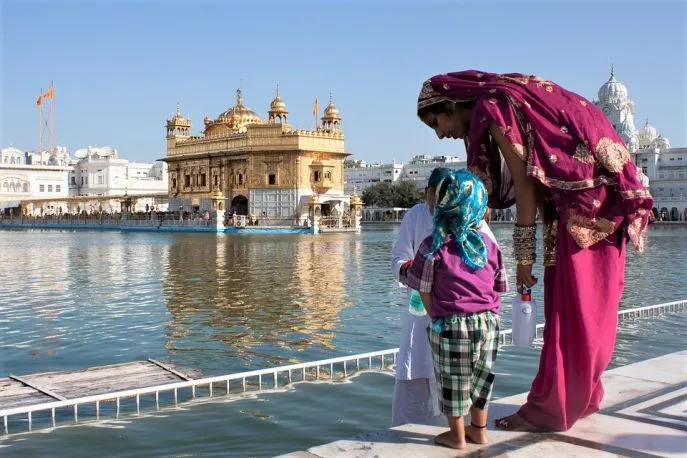 Amritsar ist die heilige Stadt der Sikhs. Hier finden Sie das wichtigste Heiligtum der Sikhs, den Goldenen Tempel (auch bekannt als Hari Mandir). Dieses imposante Gebäude wird täglich von Hunderten von Pilgern besucht. Ein buntes und beeindruckendes Ensemble. Der Goldene Tempel spiegelt sich im umgebenden Bassin (Amrit Sarovar), das wiederum von einem Quadranten weißer Gebäude umgeben ist, in denen die Unterkünfte für Priester und Pilger untergebracht sind. Hier bewegen sich Sikhs in bunten Gewändern mit ihren charakteristischen Bärten, Turbanen und jeder trägt ein gebogenes Dolchmesser an seinem Gürtel.