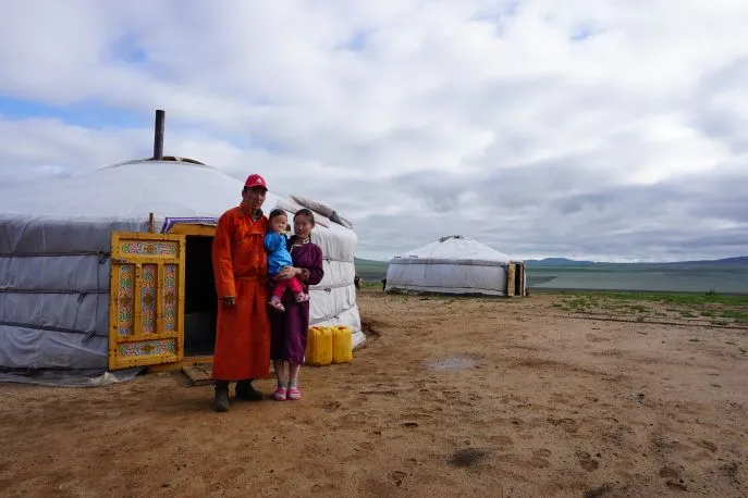 Ein Beispiel für einen Nomadenaufenthalt ist der bei dem jungen Paar Khishighbat und Tuvhinbayar und ihrer 1,5 Jahre alten Tochter. Sie wohnen in einer traditionellen Jurte mit einem modernen Touch (Solarzellen und Flachbildfernseher) im wunderschönen, weiten Khugnu Khan Tal. Dieses weitläufige Naturschutzgebiet bietet viele wunderschöne Landschaften, die Sie auf einen Blick sehen können, von Hügeln über Wälder bis hin zu weiten Wüstenlandschaften. Ein atemberaubender Anblick!