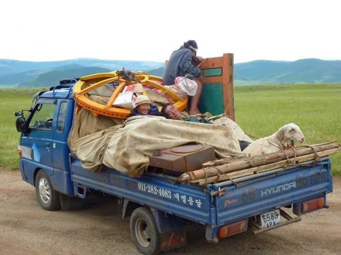 Sie können bereits unterwegs die ersten Gers sehen. Asphalt Straßen gibt es im Land kaum; einige Hundert Kilometer rund um die Hauptstadt und das war es dann auch. Sofort fällt die immense Leere und Weite des Landes auf; es leben nur 2,5 Millionen Menschen in einem Land, das fünf Mal so groß ist wie Frankreich, wobei die Hälfte davon in Ulaanbaatar wohnen.