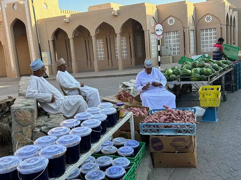 Wenn Sie an einem Mittwoch von den Wahiba Sands nach Nizwa reisen, können Sie unterwegs einen Stopp im kleinen Städtchen Ibra einlegen. Der tägliche Souq veranstaltet jeden Mittwoch einen traditionellen Frauenmarkt im überdachten Teil des Souqs. Die Frauen sind farbenfroh verschleiert, und einige tragen auffällige Gesichtsmasken mit spitzen Nasen. Es ist ein reges Treiben von weiblichen Händlern und Verkäuferinnen aus der gesamten Region, die wunderschöne Stoffe, duftenden Weihrauch, köstliche Gewürze, Kleidung, gewebte Kissen und handgefertigte Körbe anbieten.