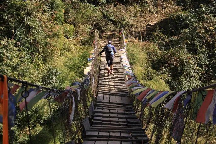 Von Thadepati steigen Sie steil hinab durch einen offenen Wald, der im Frühling in voller Blüte mit Rhododendren steht. Sie passieren kleine Stupas und möglicherweise begegnen Sie einer verirrt umherwandernden Kuh. Unterwegs genießen Sie schöne Ausblicke auf das Tal und die Dörfer, die hier und da verstreut liegen. Sie steigen bis zu einem kleinen Fluss ab, den Sie über eine mit tibetischen Gebetsfahnen geschmückte Hängebrücke überqueren. Anschließend folgt ein kurzer Aufstieg zum Sherpa-Dorf Melamchi (2630 m). Auch heute sind Sie etwa 3 bis 4 Stunden unterwegs. Die Zimmer in der Unterkunft hier sind sehr komfortabel; die Ausblicke über das Tal sind herrlich. Die Region hat während des Erdbebens von 2015 erhebliche Zerstörungen erlitten. Im Dorf sind die Folgen noch sichtbar, aber es wird auch fleißig wieder aufgebaut.