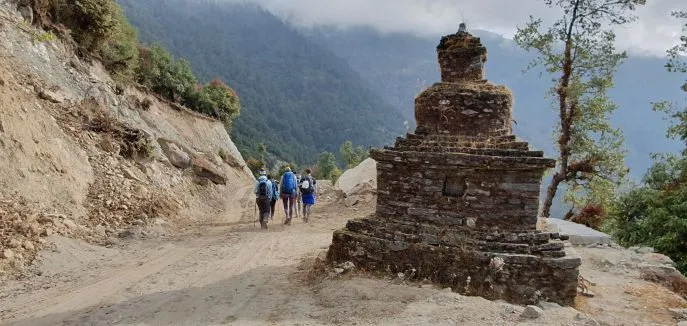 Heute ist, was die Distanz betrifft, der längste Wandertag, aber er ist sicherlich nicht der schwierigste. Der Weg zieht sich durch das Tal, verläuft ein Stück über den Grat des Tals und passiert verschiedene Bäche, Stupas und kleine Dörfer. Sie wandern auf einem leicht hügeligen Pfad, der mal nach oben, mal nach unten geht; jedoch niemals wirklich steil. Die Einheimischen nennen dies „Nepali flach“.