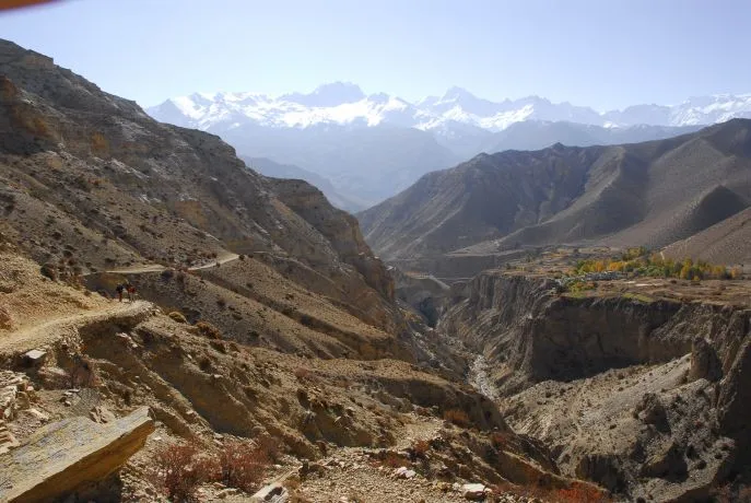 Sie wandern weiter nach Jomsom, dem Anfangs- und Endpunkt der Trekkingtour durch Mustang. Unterwegs passieren Sie Kagbeni, das bekannt ist für sein großes Kloster. Außerdem gibt es einige interessante Stupas und Chortens. Wenn es die Zeit zulässt, können Sie das Kloster besuchen. Schauen Sie unbedingt auf das Dach, denn von hier haben Sie einen wundervollen Blick über das weite Kali-Gandaki-Tal. Unterwegs kommen Sie auch durch das mittelalterliche Dorf Jharkot mit einer verfallenen Dzong und einem Bon-Kloster. Jomsom liegt am Ufer des Kali-Gandaki-Flusses. Auf der einen Seite des Flusses erheben sich die Annapurna-Berge und auf der anderen Dhaulagiri. Hier befinden Sie sich in der Nähe von 8 der 20 höchsten Berge der Welt. Der Kali-Gandaki-Fluss ist äußerst breit und im Sommer trocken, während er im Winter mit Regenwasser und Schmelzwasser von dem Schnee gefüllt ist.