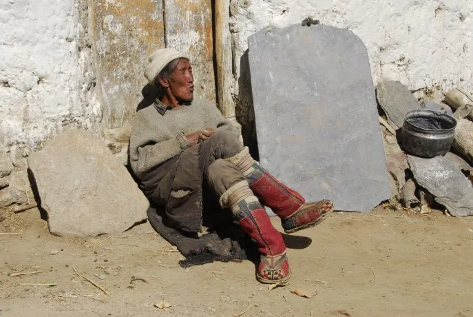 Heute wandern Sie etwa 6 Stunden zu dem auf 3200 Metern Höhe gelegenen Chele. Abhängig von den Bedingungen gehen Sie entweder durch das Flussbett oder über einen höher gelegenen Grat. Sie passieren ein Nyingmapa-Kloster (Kang). Das erste Dorf ist Tangbe. Dies ist das erste Dorf mit einem typischen Mustang-Charakter. Sie sehen schwarz-weiße und rote Stupas. Das Dorf ist ein Labyrinth aus Gassen, umgeben von weißen Häusern und Feldern voller Gerste, Weizen und Apfelplantagen. Die Umgebung besteht aus herrlichen rot gefärbten Felswänden voller Höhlen. Ein Anstieg führt Sie zum tibetischen Dorf Chele. Die Häuser haben Schafhörner an der Tür, um die Dämonen fernzuhalten, und bedrohliche tibetische Hunde bewachen die Häuser. Hier sehen Sie zunehmend chinesische statt indische Waren im Dorf, ein Zeichen für sich verändernde Handelsrouten.