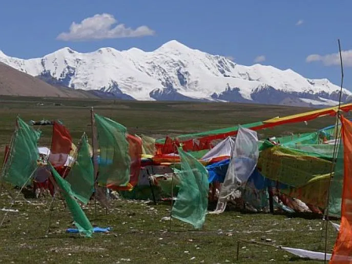 Eine wunderschöne Fahrt von etwa 4 Stunden führt Sie durch die Grasländer von Amdo. Sie überqueren einige hohe Pässe und haben von der Spitze aus einen herrlichen Blick über die Region. Hier sehen Sie normalerweise viele schwarze Nomadenzelte der Golok-Tibeter. Am Ende des Tages kommen Sie in Machen (3800 Meter) an. Diese Provinzstadt (auch Maqin oder Dawu genannt) ist die größte Stadt der Region, dennoch relativ klein. Am Rand der Stadt liegt ein Hügel, der mit Gebetsfahnen übersät ist. Diese üppige Verwendung von Gebetsfahnen ist typisch für Amdo.