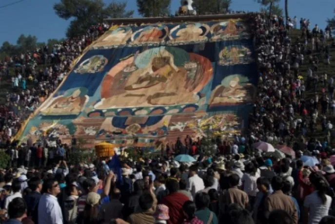 Während unseres Besuchs findet ein großes religiöses Festival statt. Im Kloster führen die Mönche maskierte Tänze auf, begleitet von Trommeln, Hörnern und Zimbeln, und unter dem wachsamen Auge eines bunt gekleideten Publikums. Zudem wird ein riesiger Thangka ausgerollt, ein für die tibetischen Zuschauer sehr bedeutendes Ereignis.