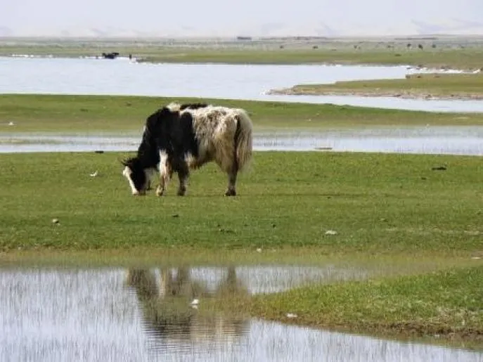 Von Maduo aus fahren wir auf das Plateau, auf der Suche nach der Quelle des Gelben Flusses. Zwischen zwei Seen entspringt ein kleiner Fluss auf einem 4600 Meter hohen Berg, dem Cuorigaze. Hier wurde ein Denkmal, die Niutoubei, errichtet, um offiziell anzuzeigen, dass dies die Quelle des Gelben Flusses ist. In der Nähe befinden sich zwei schöne Seen, der Zhaling-See, auch bekannt als der Große Weiße See, und der Eling-See, der Große Blaue See. Die Umgebung ist öd, ein karges Plateau in über 4000 Metern Höhe, aber von einer rauen, bezaubernden Schönheit.