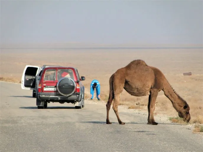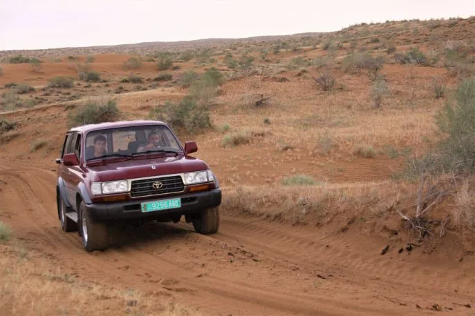 Heute reisen Sie den ganzen Tag „off-road“ und ziehen quer durch die Karakum-Wüste. Die Route führt über den harten Lehmboden ehemaliger Flussbetten und über Sanddünen. Manchmal kommen Sie an Wasserquellen vorbei, wo Gruppen von Schafen und Ziegen sich am Wasser laben, bevor sie von ihren Hirten weitergetrieben werden, auf der Suche nach einem frischen Happen von einem „Saksau“-Bäumchen oder einem „Kameldorn“-Strauch. Sie können sich dort auch kurz erfrischen und ein Gespräch mit dem „Personal“ der Quelle führen, das die Pumpe bedient.