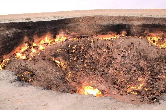 Anschließend reisen Sie weiter in die Karakum-Wüste und übernachten in der Nähe von Darwaza, wo Sie in der Nähe eines seltsamen Phänomens übernachten: einem Gaskrater in der Wüste, der seit Jahrzehnten brennt. Kein Naturphänomen, sondern ein Fehler von sowjetischen Geologen. In den 1970er Jahren wurde hier nach Öl und Gas gebohrt. Plötzlich brach der Boden ein, man stieß auf ein unterirdisches Höhlensystem und auf ein Gasvorkommen. Das Gas verbreitete sich durch das Höhlensystem. Die Geologen dachten, das Problem zu lösen, indem sie das Gas abbrennen ließen, und zündeten es weise an. Das Gas brennt immer noch! Besonders nachts bietet dies ein beeindruckendes Bild; die verlassene Wüste und die brennende Feuerstelle. Sie übernachten in einer gemeinsamen Jurte oder einem Privat-Zelt mitten in der Wüste. In der Nähe der Feuerstelle genießen Sie ein typisches turkmenisches Barbecue.