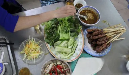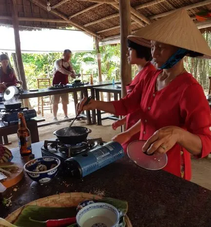 Gemeinsam mit Ihrer Gastgeberin und ihrer Großmutter bereiten Sie verschiedene lokale Spezialitäten zu, wie Banh Xeo, grüne Papayasalat und gegrillte, marinierte Schweinefleischspieße in köstlicher Soße, die Sie anschließend selbst genießen können!