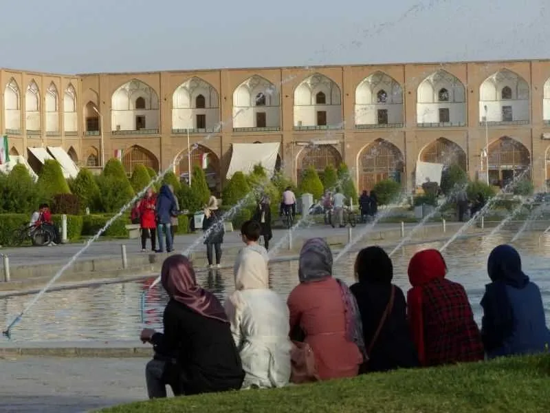 "Ganz in der Nähe des Khomeiniplatzes in Isfahan – einem riesigen Platz, der umgangssprachlich als 'die halbe Welt' bekannt ist – miete ich ein Fahrrad. Das ist an vielen Orten in der Stadt möglich, bei speziellen Ständen. Ich fahre zur Brücke mit dreiunddreißig Bögen – der Si-o-Se Pol Brücke – wo ich mein Fahrrad parke. Gemächlich gehe ich über die Brücke. Leute halten mich an, um ein Gespräch zu beginnen; einige Jugendliche machen Selfies mit mir. Auf der anderen Seite gehe ich unter der Brücke hindurch. Eine Familie aus Yazd planscht mit den Füßen im Wasser. Sie beginnen ein Gespräch und laden mich ein, mich zu ihnen zu setzen.