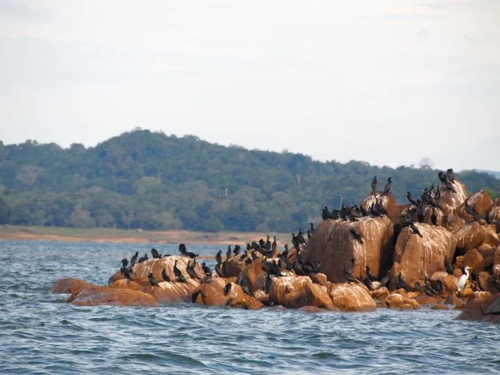 Es war ein wenig mühsam zu finden, aber schließlich finden wir das Häuschen am Wasser, wo zwei Männer bei unserem Boot auf uns warten. Schwimmwesten an und an Bord. Mein Fahrer hat etwas im Auto vergessen und steigt wieder aus. Ich muss lachen, als er wenig später mit einer Kamera um den Hals zurückkommt. Das ist auch für ihn eine neue Erfahrung, und davon muss es heute Abend auf Facebook ein Foto geben, sagt er. Die Bootssafari über den See – übrigens der größte Stausee in Sri Lanka – ist sehr schön: wir fahren an verschiedenen Inseln vorbei, auf denen unter anderem viele Vögel, Affen, Krokodile und Elefanten zu sehen sind. Highlight hier sollten die Herden schwimmender Elefanten sein, die regelmäßig zwischen den Inseln schwimmen! Leider hatten sie heute nicht viel Lust dazu, also sehe ich nur Elefanten an Land. Die Vermutung mit dem Schakal scheint weiterhin zu stimmen.